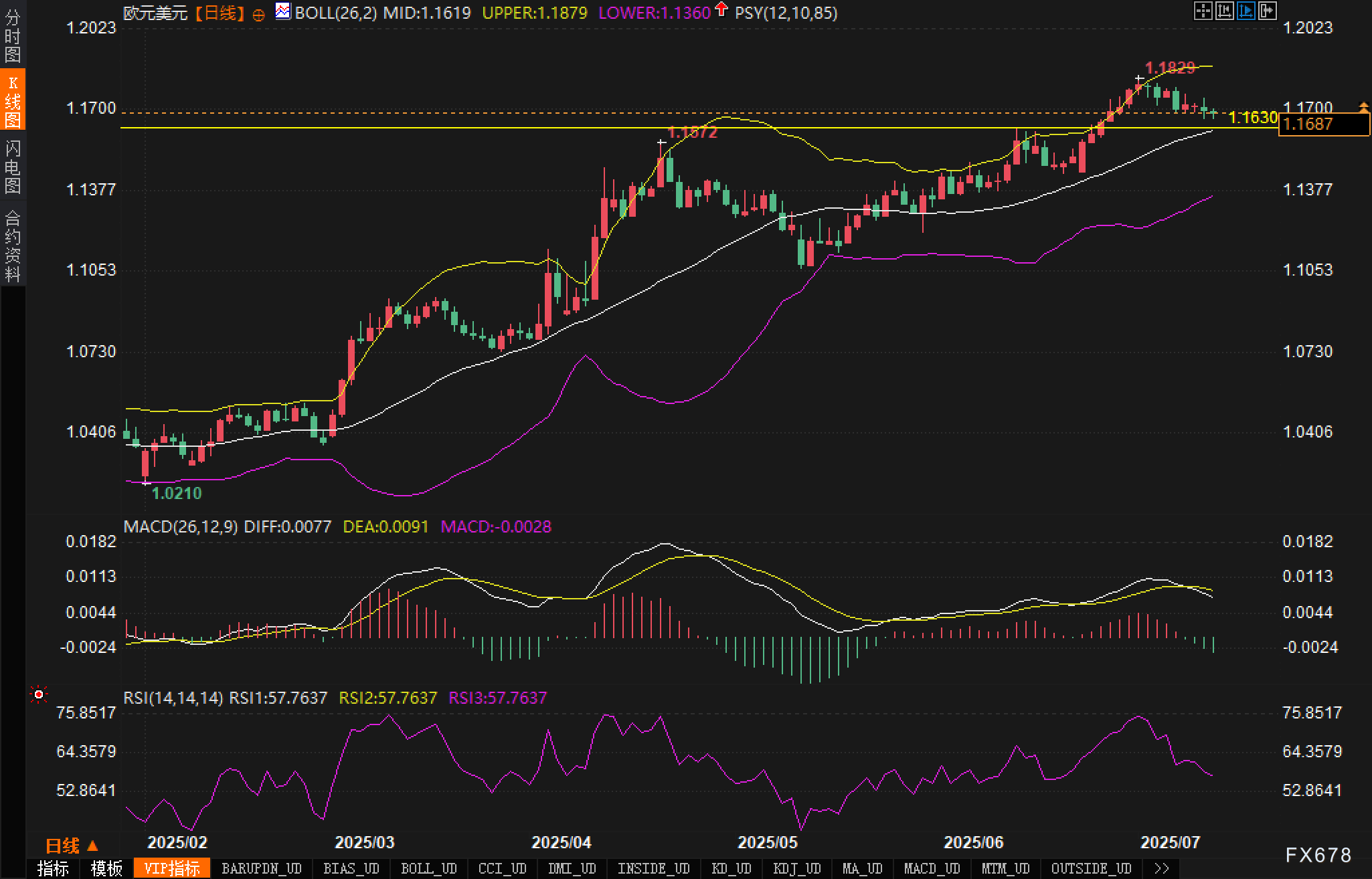盈凯外汇官网报道——周五(7月11日),欧元兑美元连续第三日承压,欧洲时段交投于1.1690附近,日内最低触及1.1665。近期汇价创下阶段高点1.1829后出现持续性调整,周线暂录得约0.8%的跌幅。本轮调整伴随着美方宣布将欧盟列入新一轮关税清单,并上调对其他国家的关税税率至15%-20%,打压市场风险偏好情绪。