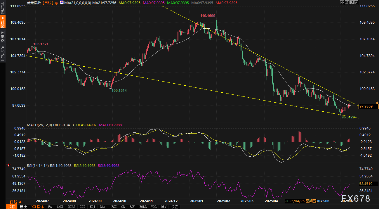 从技术面看,美元指数(DXY)自6月1日触及三年多低点96.38后,逐步企稳并展开反弹,目前交投于97.80附近,日内小幅回落约0.2%。日线图显示,DXY当前位于50日均线(97.65)、100日均线(97.50)和200日均线(97.30)上方,表明短期趋势有所改善,但仍受制于97.80-98.00的关键阻力区间。这一区间不仅是近期盘整的高点,还与下降楔形的上轨重合,构成多重技术压力的汇聚点。