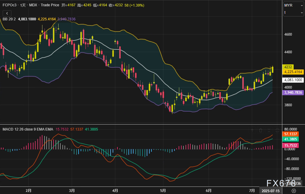 盈凯外汇官网报道——周一(7月14日),马来西亚衍生品交易所(BMD)棕榈油主力合约FCPOc3收报4232林吉特/吨,单日涨幅1.39%,创下近三周新高。日线级别布林通道中轨站稳4083林吉特支撑,MACD指标金叉初现,技术面呈现多头蓄势特征。此番上涨主要受三重因素驱动:国际原油价格走强、竞争油脂价格普涨,以及林吉特汇率疲软带来的出口价格优势。