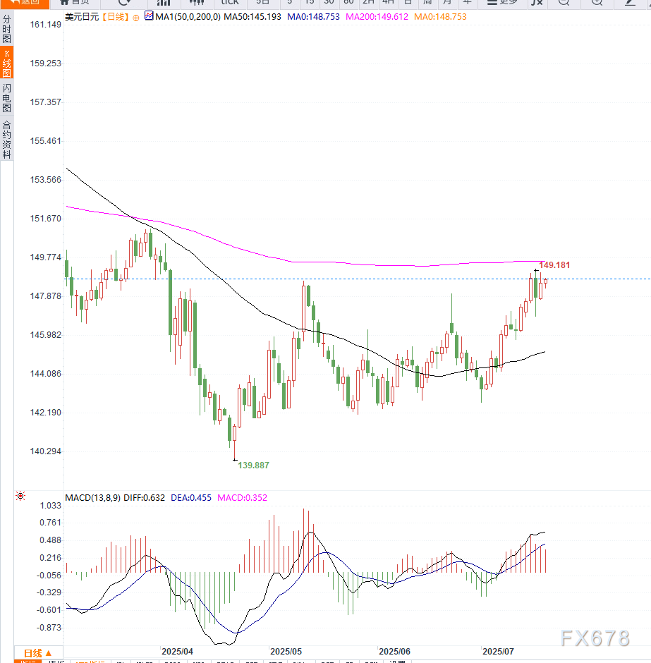 从技术结构来看,USD/JPY仍处于多头通道中,上方阻力:149.15-149.20为短期关键阻力区域,若有效突破则有望测试150整数关口,甚至向151发起挑战。