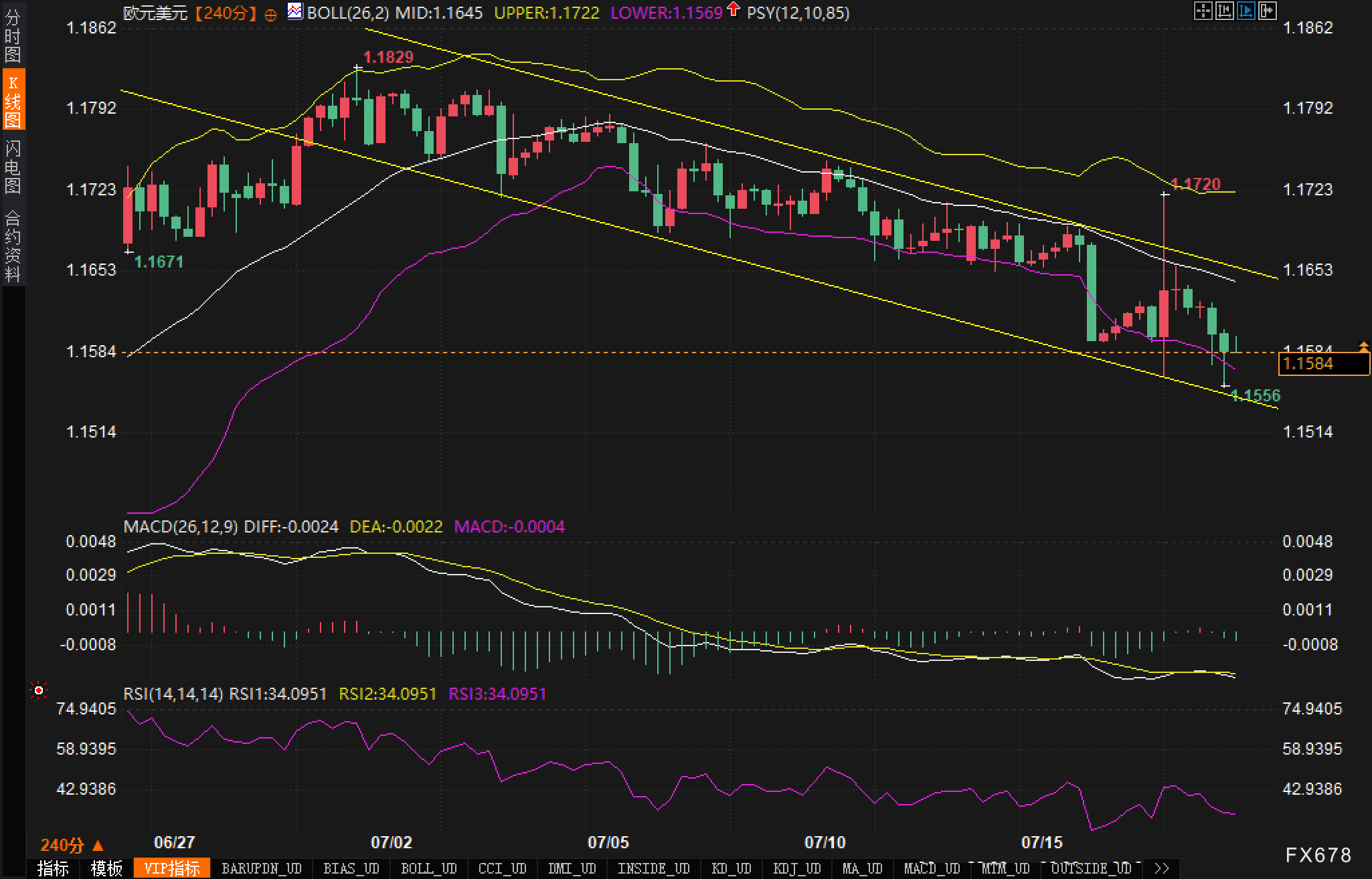 欧元/美元在4小时图上呈现明显的下降通道结构,布林带三轨亦同步向下,显示出中短期趋势动能偏弱。当前汇价运行在布林带下轨与下降通道下边线附近,形成“加速下行”的态势。价格重心持续下移,标志着空头仍在主导市场。