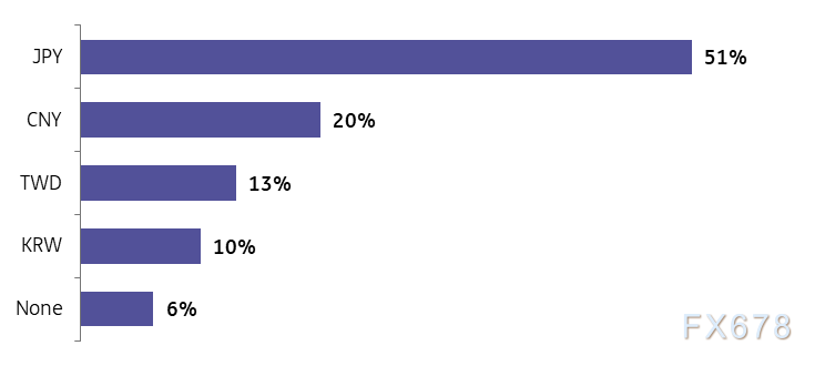 有趣的是,日元在一项调查中位居榜首,该调查询问哪种亚洲货币在未来12个月内的升值潜力最大,投票结果显示有51%的选票投给了日元。