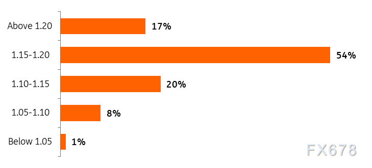 ING称,今年投资者的投票显示了一个强烈的方向性的预见,即美元贬值,而不是前几年通常呈现的正态分布。从投票结果看,71%的投资者预计欧元兑美元将在今年年底收于1.15以上。相比之下,六月初进行的上一轮投票中,有60%的投资者持相同观点。