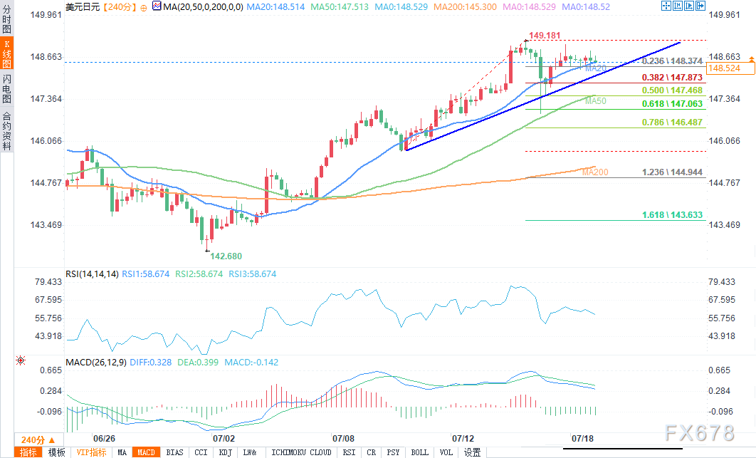 美元/日元近期走势在146.50上方企稳,突破147.50和148.00阻力位后进入上行通道,但随后在149.20附近形成短期高点,进入盘整阶段。从4小时图看,价格在148.00附近获得支撑,一条看涨趋势连接线在148.00进一步强化支撑。