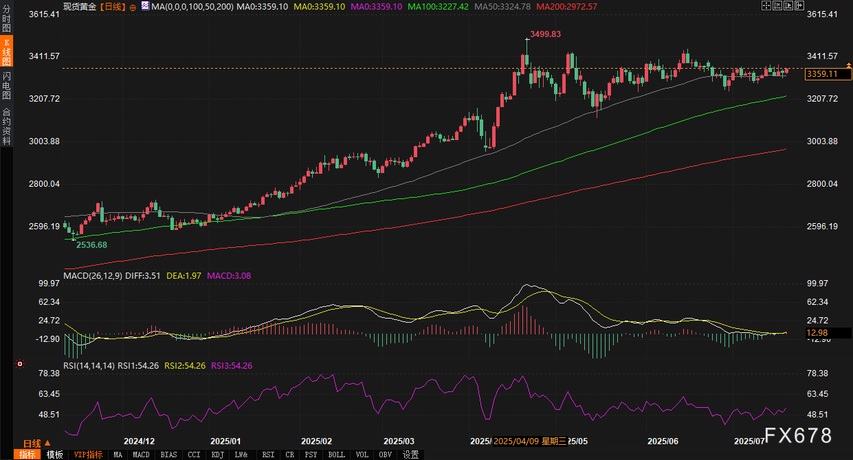 现货黄金价格报3357.78美元/盎司,日内上涨0.57%,显示避险需求和通胀预期共同支撑价格走高。日线图上,黄金价格站稳50日均线(3324.75)上方,并突破100日均线(3227.40),展现较强的上行动能。200日均线(2972.57)作为长期趋势参考,表明黄金仍处于长期上升通道。MACD指标显示,DIFF值为3.46,DEA为1.96,MACD值为3.00,呈现金叉状态,表明短期趋势偏多。RSI为54.16,接近超买区域,提示短期涨幅可能放缓,但整体动能仍偏正面。