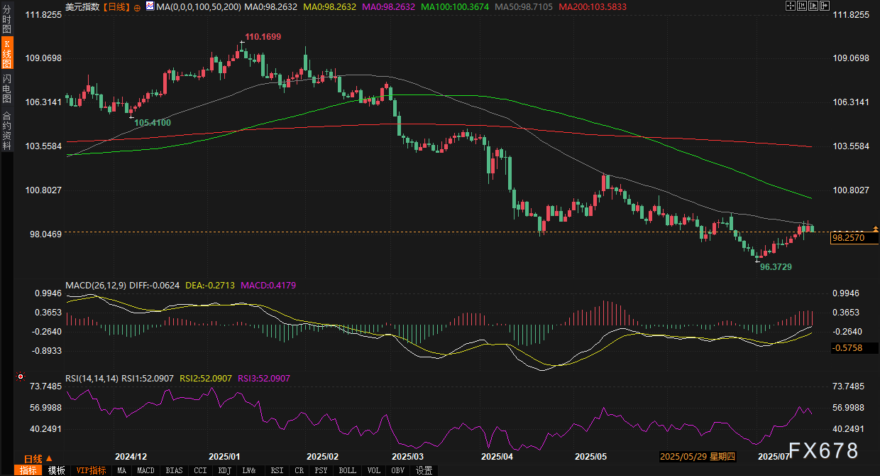 美元指数当前报98.2742,日内下跌0.38%,反映市场对美联储政策预期调整的敏感反应。从日线图看,美元指数已跌破50日均线(98.7105),并进一步远离100日均线(100.3674)和200日均线(103.5833)。这表明中长期趋势偏空,短期内市场情绪倾向于看淡美元。MACD指标显示,DIFF值为-0.0617,DEA为-0.2714,MACD值为0.4184,快线与慢线趋于收敛,暗示下行动能有所减弱,但尚未形成明确的反弹信号。RSI指标为52.0856,位于中性区域,表明市场未出现超买或超卖,短期可能延续震荡格局。