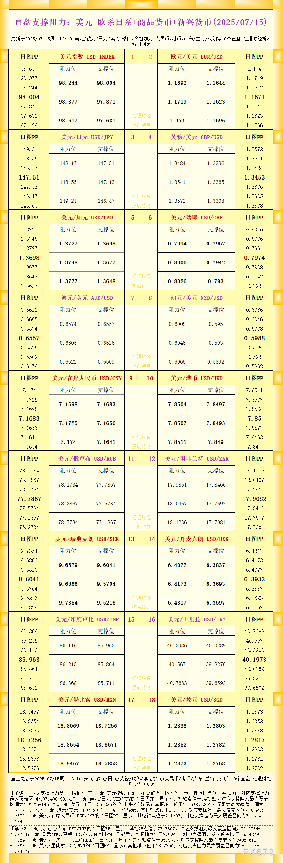 盈凯官网:一张图看18个直盘外汇支撑阻力:美元+欧系日系+商品货币+新兴货币(2