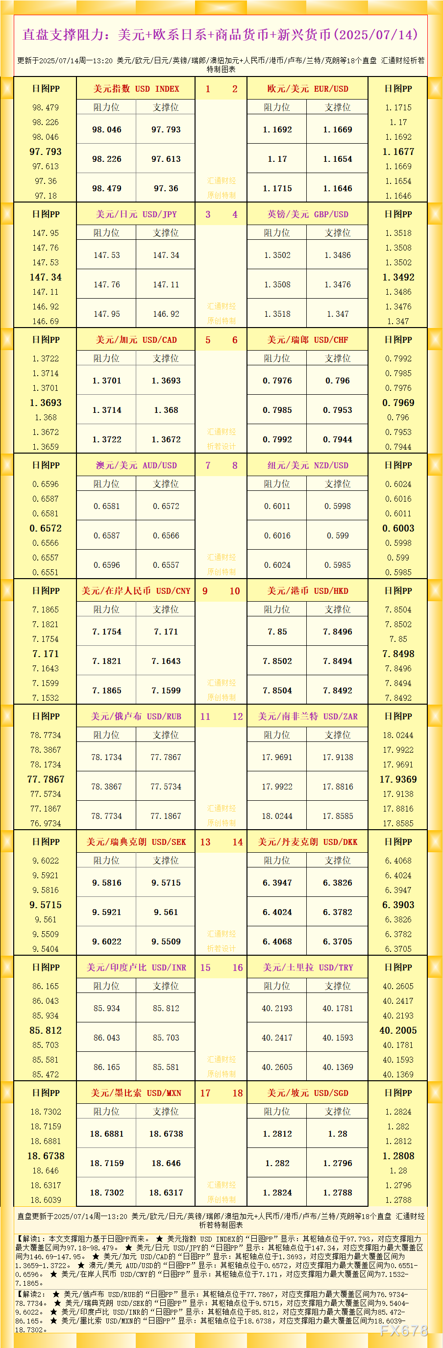 盈凯中文官网:一张图看18个直盘外汇支撑阻力:美元+欧系日系+商品货币+新兴货币