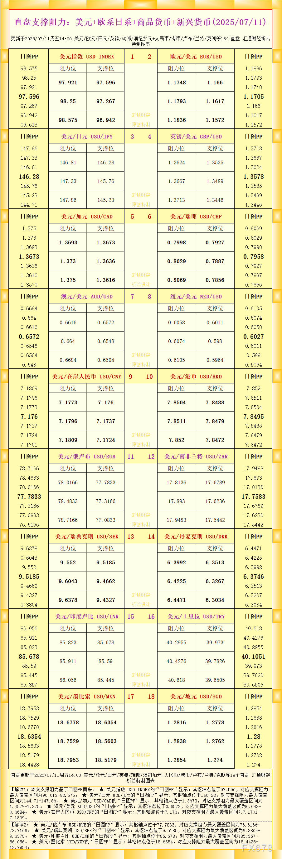 盈凯官网:一张图看18个直盘外汇支撑阻力:美元+欧系日系+商品货币+新兴货币(2