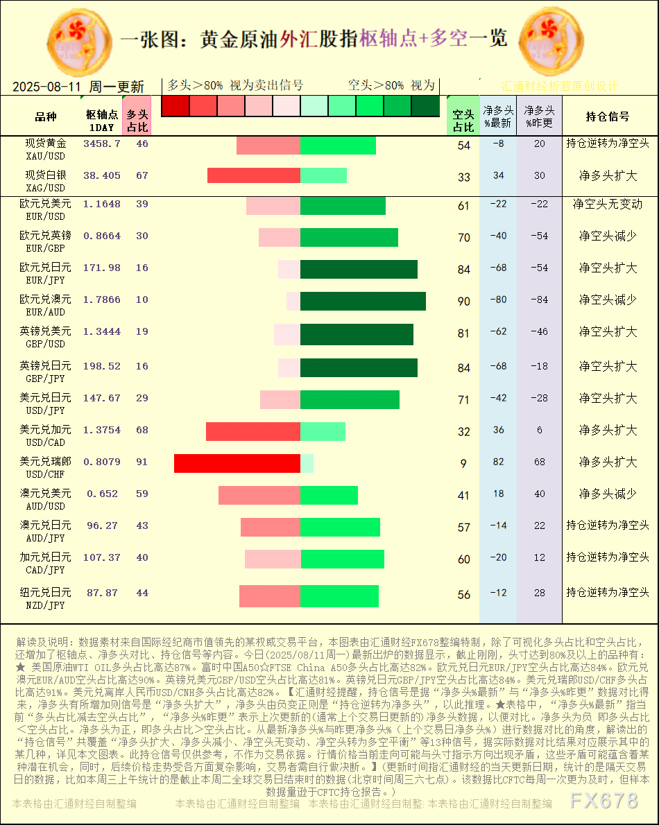 盈凯官网:一张图:2025年8月11日黄金原油外汇股指“枢纽点+多空持仓信号”一